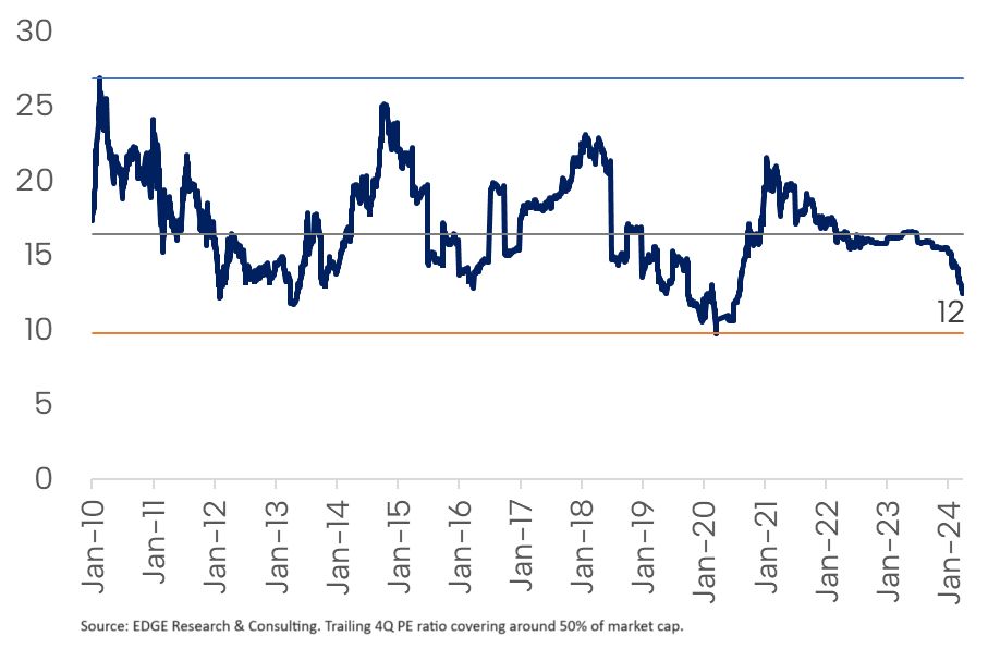 The PE ratio chart is till the end of March 2024. Using April numbers would show something closer to 11x and bring it very close to the all-time low of 10x that we saw during the COVID-19 pandemic.