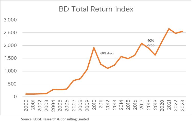 After the peak of 2010, the stock market in Bangladesh fell by around 60% before turning around. The next peak came in around 2017, after which the index fell around 40%. The latest peak was during the post-COVID liquidity frenzy of 2021. The drop in index values is summarized below