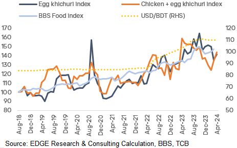 Broadly the rapid uptrend in food prices seems to have stopped. Index values peaked in Mid 2023. After some decline, we saw an uptick during Ramadan. We are still waiting for April 2024 BBS data to compare with our version of food inflation.
