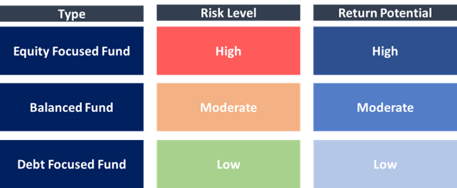 The more equity-concentrated a fund is, the riskier it is. Likewise, the more debt-concentrated a fund is, the less risky it is. Balanced funds, that is, funds with almost equal concentrations in both equity and debt securities, will represent moderate levels of risk. Ideally, an investor’s risk appetite will match the risk level of mutual funds. That is why someone who wants more certain and less volatile returns will go for debt-focused/fixed-income funds most likely, and, on the other hand, someone targeting volatility-driven higher returns will go for equity-focused funds.